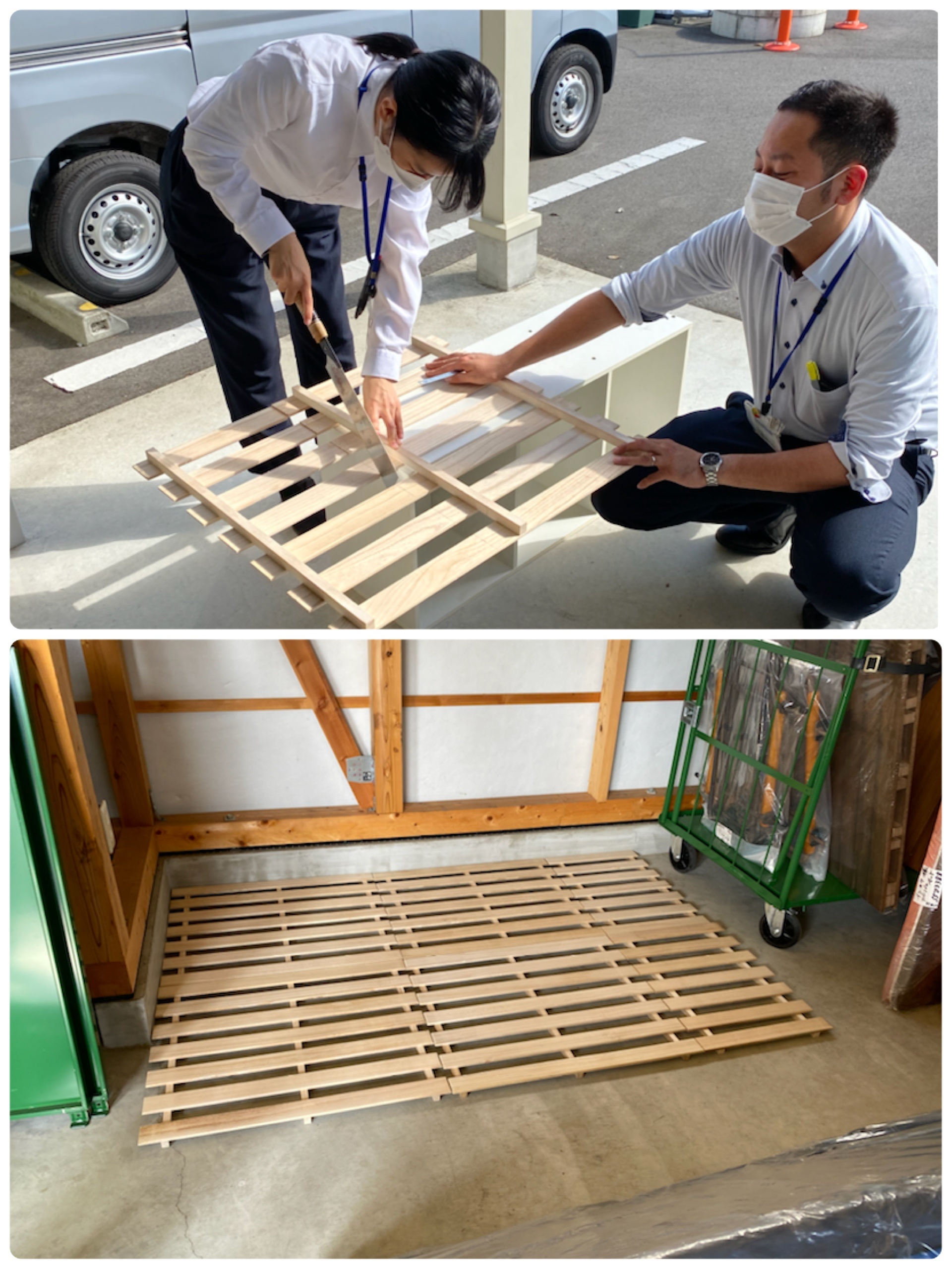 ちょうどいい規格のすのこが売ってなく、社員たちでカットすることになったのですが、