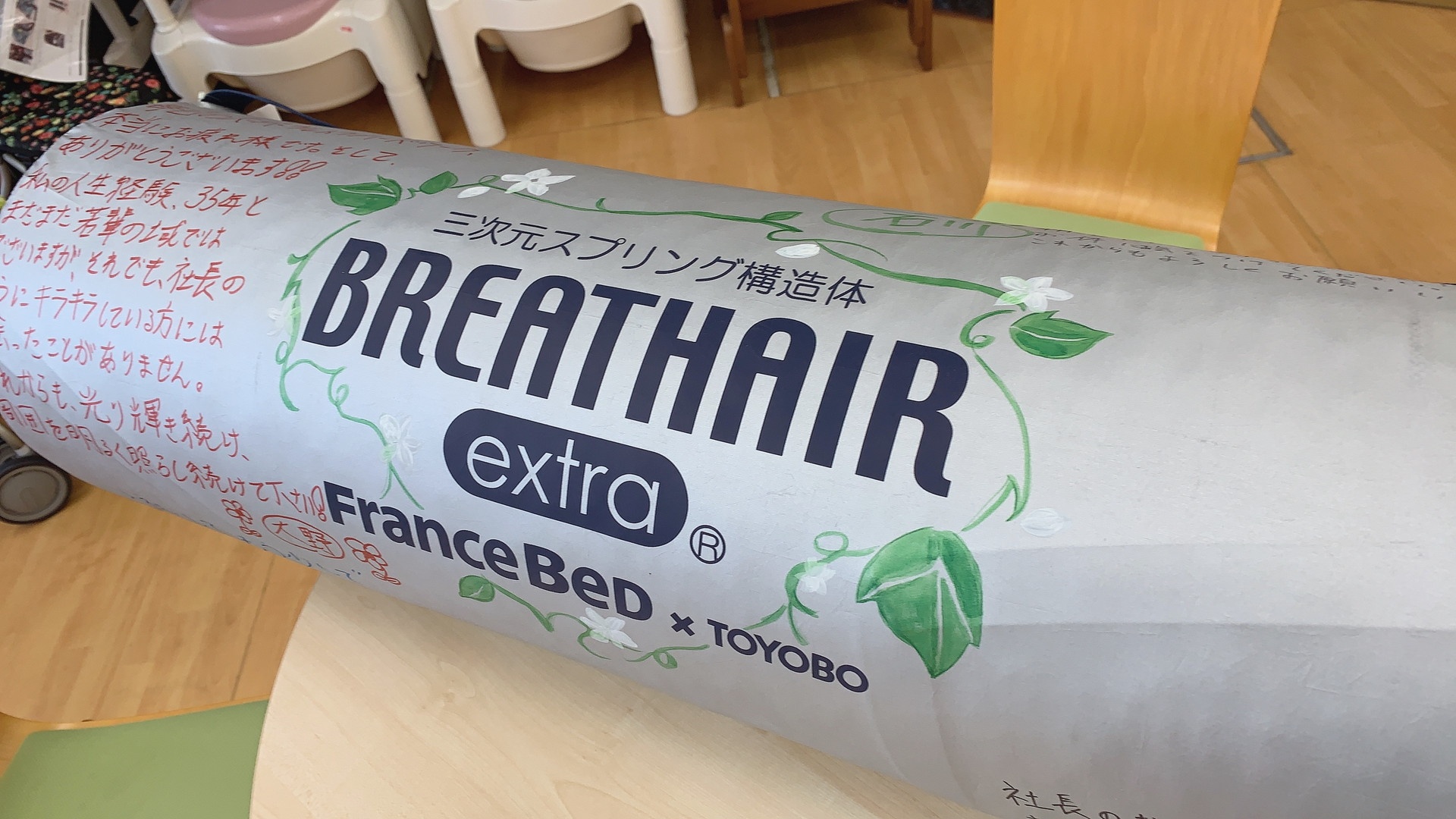 マットレスケースに全員で普段からの感謝の言葉や想いを書き、社長にお渡しすると非常に喜んでいただきました。